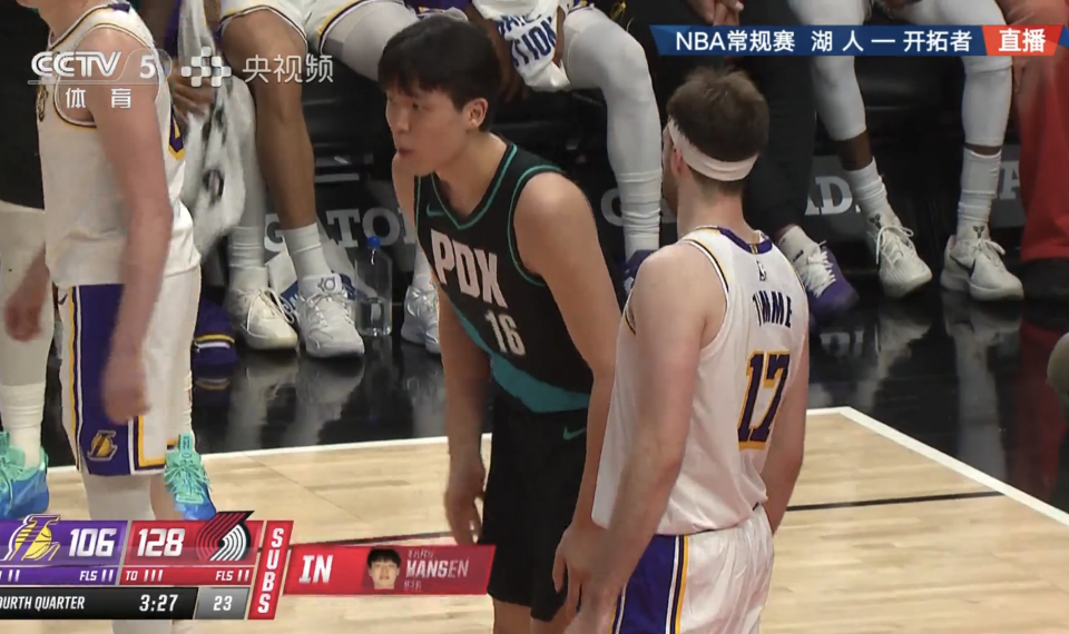 在这场与湖人的比赛之前,开拓者再次宣布在发展联盟召回杨瀚森,小杨坐在替补席第二排等待机会。首节开拓者打得极具杀伤力,裁判频频吹罚湖人球员犯规。开拓者第一节结束以40-27领先,开拓者全队罚球22次,罚球得分17分,湖人的罚球仅为3中2。第二节湖人赢了3分,随着夏普高高跃起空接扣篮,半场打完开拓者71-61湖人。