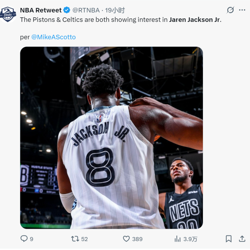 据NBA名记Michael Scotto报道,活塞和凯尔特人有意灰熊内线小贾伦·杰克逊。目前灰熊只把莫兰特摆上货架,还没决定是否交易3J。就在本周,詹姆斯经纪人里奇-保罗公开提议,湖人应该用里夫斯换3J。你没看错,3J这么抢手!