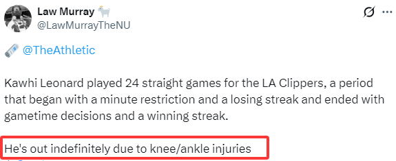 快船记者Law Murray报道,这次受伤的并不是小卡此前多次接受手术的那个膝盖,在快船主场迎战湖人之前,快船将对小卡的身体状况进行重新评估;该记者还表示,小卡为快船连续出战了24场比赛,他因膝盖和脚踝受伤将无限期休战。