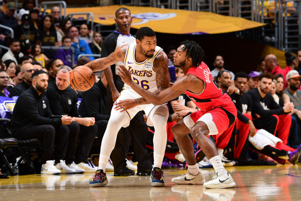 易边再战,湖人一波9-3扩大领先优势,之后英格拉姆和奎克利带队11-3反超比分并且打停比赛;比赛继续,东契奇和詹姆斯连续得分止住颓势,巴恩斯中投得分,两队交替领先打得十分胶着,打着打着猛龙进攻断电,八村垒和詹姆斯连中三分,莫格博扣篮,詹姆斯助攻艾顿暴扣,八村垒再中三分,湖人一波攻势扩大领先,三节打完湖人87-80领先7分。