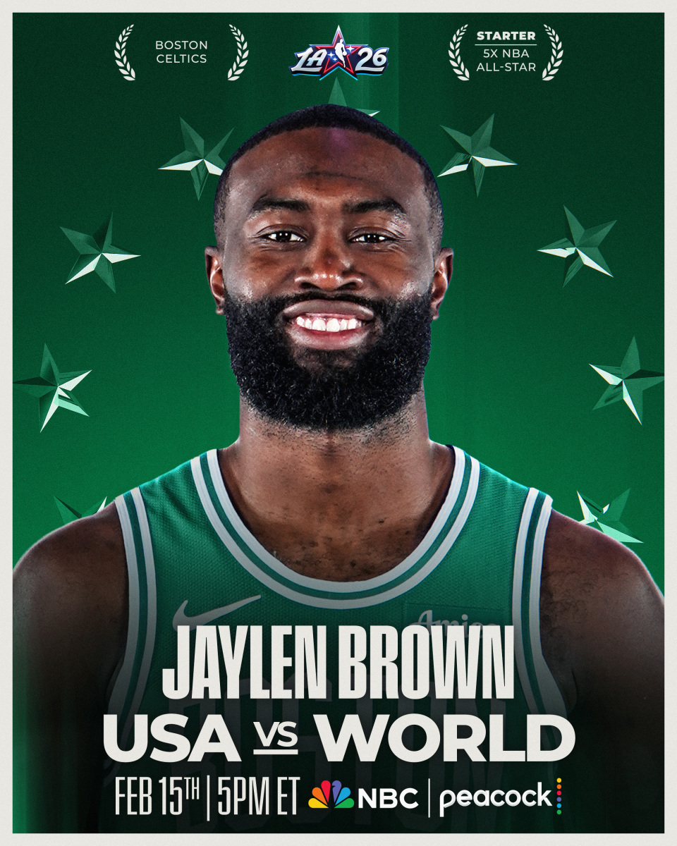 杰伦-布朗则是第五次入选全明星阵容,他在2016年第三顺位被选中。本赛季迄今为止,他在凯尔特人队场均得到 29.7 分、6.4 个篮板和 4.8 次助攻。