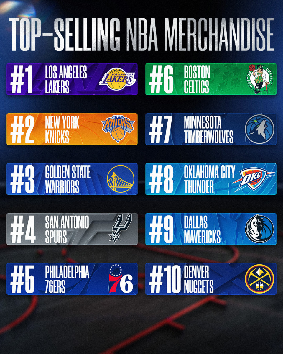 湖人背靠洛杉矶的庞大经济市场,加上坐拥东契奇和詹姆斯两大人气球星,因此持续在球队产品销量榜中占据榜首位置。排名第2的尼克斯,或许是受到在NBA杯夺冠影响,因此力压人气极高的勇士。