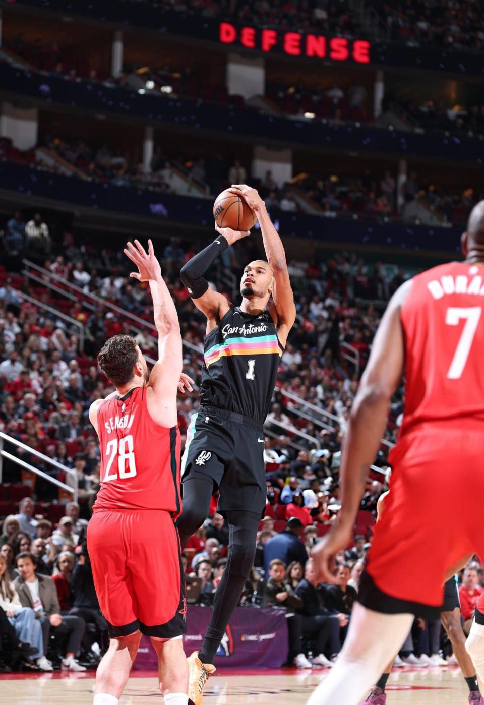 次节比赛,文班亚马和哈珀连续得手,谢泼德和阿门给出回应。阿门打成2+1,文班亚马连续得手。申京打成2+1后,约翰逊和尚帕尼连续砍分稳住局面。谢泼德和杜兰特连得4分,约翰逊和巴恩斯连得5分。伊森和史密斯先后得分,科内特完成空接,尚帕尼三分再中。杜兰特命中三分后,福克斯和文班亚马连续得手,申京一人先是命中三分然后两罚全中,马刺队70-60领先火箭队结束上半场比赛。