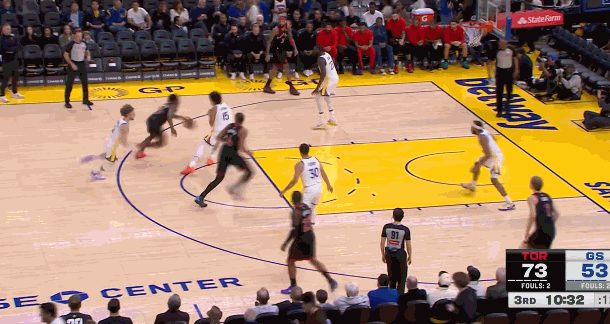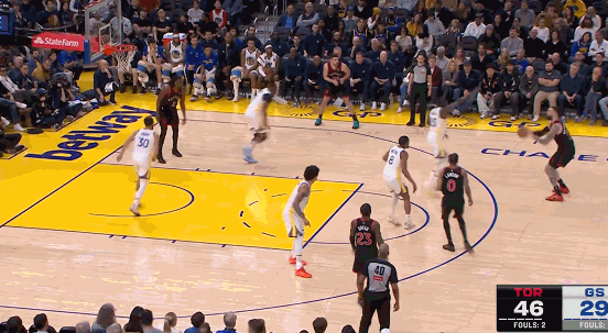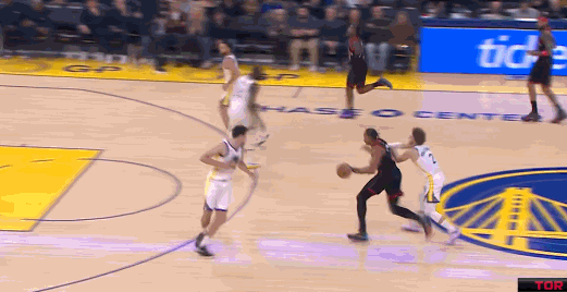 上半场,猛龙三人得分上双,奎克利18分2篮板3助攻,巴恩斯14分4篮板6助攻,马穆凯拉什维利11分8篮板3助攻。勇士只有库里一人得分上双,他得到12分,投篮13中5,三分6中1。