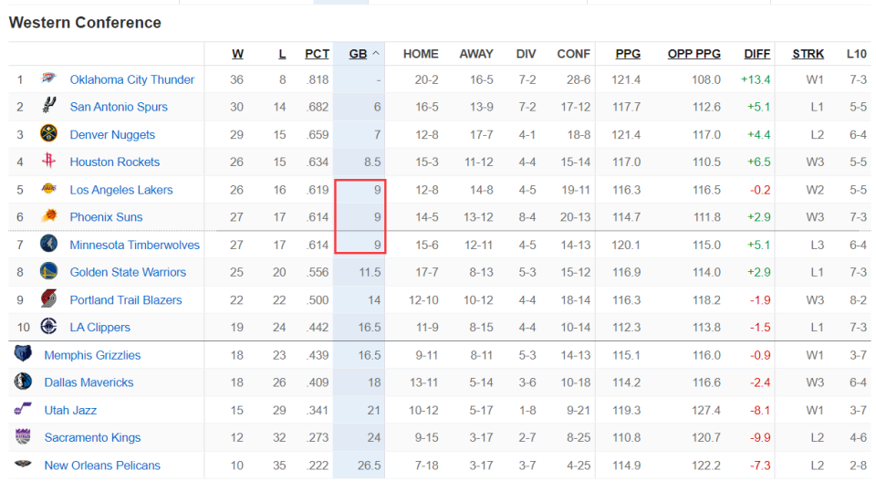 大家可以看到西部第五的湖人26胜16负、西部第六的太阳27胜17负 、西部第七的森林狼27胜17负,这三队的胜率几乎相同,所以西部大乱斗会延续下去。