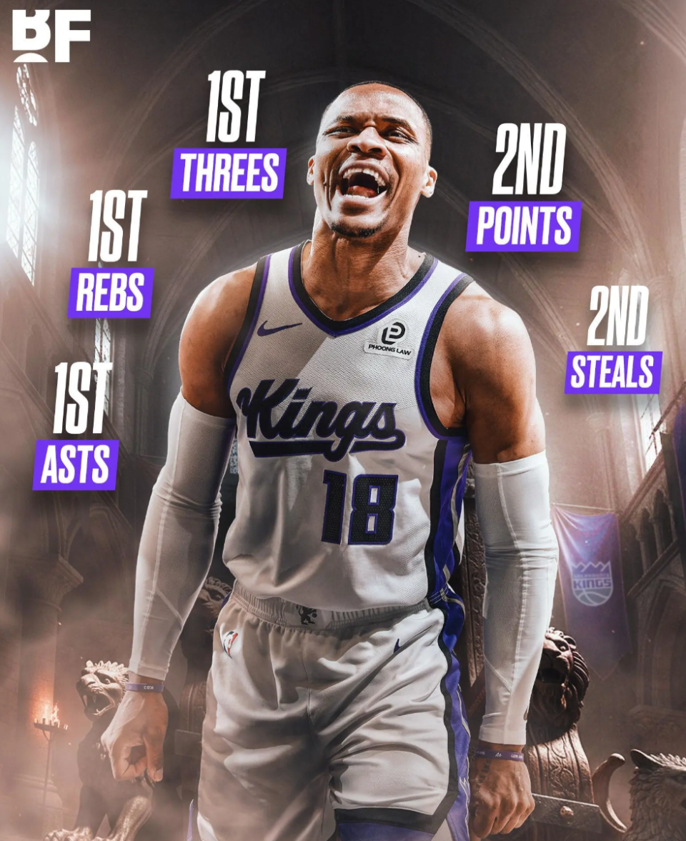 此役转播方还在比赛间隙晒出威少本赛季在国王的数据,得分678分第二、三分89个第一,篮板272个第一,助攻306次第一,抢断61个第二,就连官方都为37岁的威少点赞了。