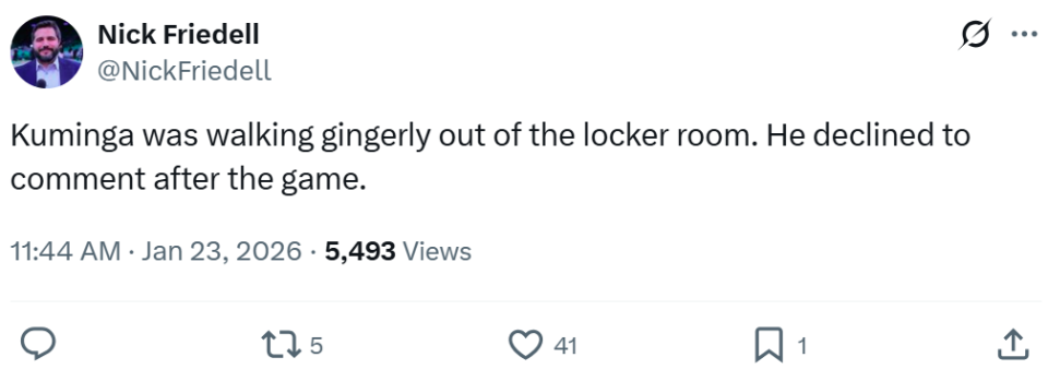 结果本场库明加又半场伤退,赛后勇士记者Nick Friedell透露,库明加一瘸一拐离开球馆,并且拒绝了采访,科尔表示库明加将接受核磁共振检查。