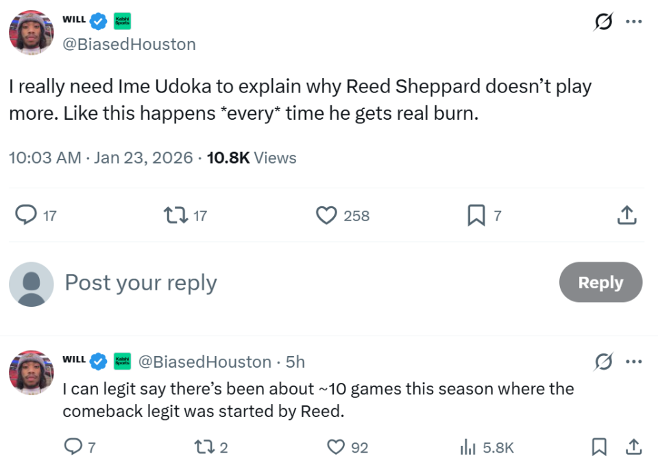 并不是只有Bradeaux一位火箭媒体人感到不解,大量火箭媒体人与当地资深球迷发声表达质疑,不理解为何谢泼德如此出色的三分手,却在进攻体系中完全无法获得任何战术安排。