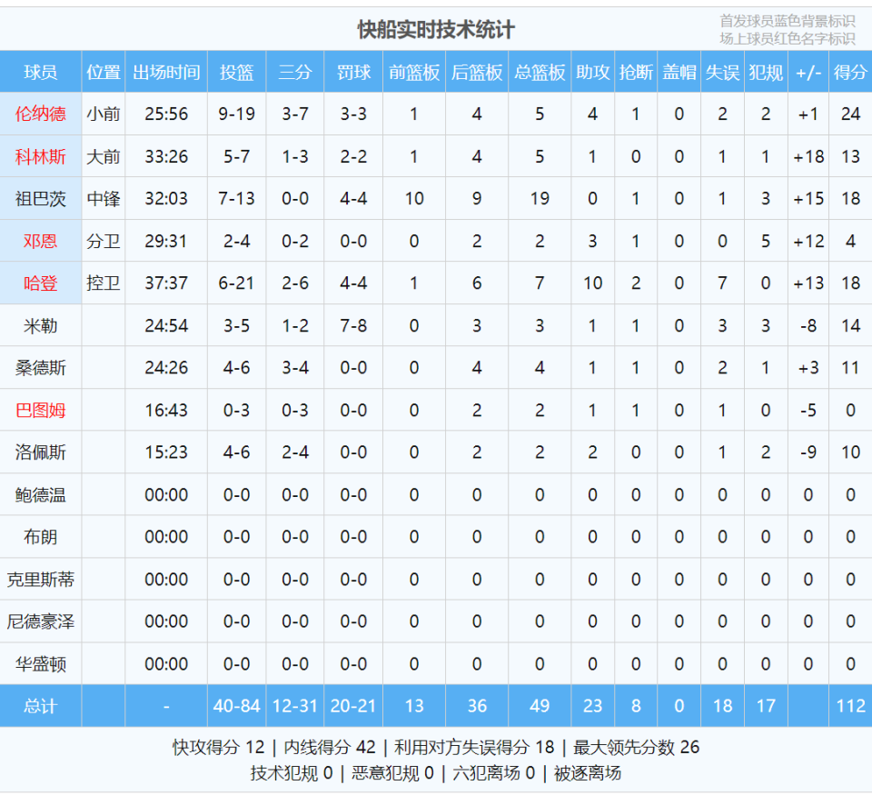 如果东契奇空位三分命中,湖人将追到3分,可惜没有如果。全场结束,快船112-104战胜湖人。最近17场比赛,快船豪取14胜3负,继续北伐!伦纳德只打了26分钟,砍下24分5板4助、祖巴茨18分19板、哈登18分7板10助7失误。