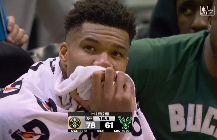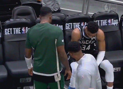 第四节还剩30多秒,雄鹿落后5分,字母哥准备下快攻时无对抗受伤。他用手捂着小腿,表情痛苦地走下场。字母哥随即退出比赛,他在板凳席上一言不发,充满着沮丧和绝望。字母哥的二哥萨纳西斯试图安慰他,依然没什么效果。