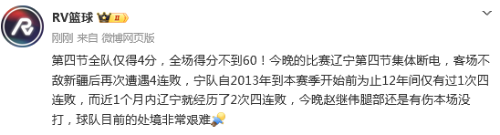 第四节全队仅得4分,全场得分不到60!今晚的比赛辽宁第四节集体断电,客场不敌新疆后再次遭遇4连败,宁队自2013年到本赛季开始前为止12年间仅有过1次四连败,而近1个月内辽宁就经历了2次四连败,今晚赵继伟腿部还是有伤本场没打,球队目前的处境非常艰难。