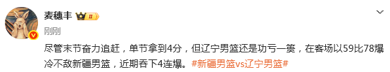 辽篮59-78不敌新疆,本赛季第二次遭遇四连败,近7场1胜6负。