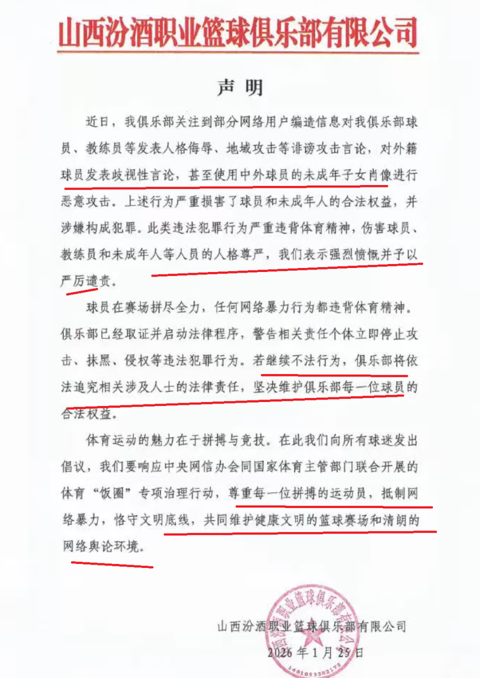 与此同时,山西队还呼吁,大家要尊重每一个努力拼搏的球员,要抵制网络暴力,要维护一个健康,文明的篮球赛场和网络舆论环境。