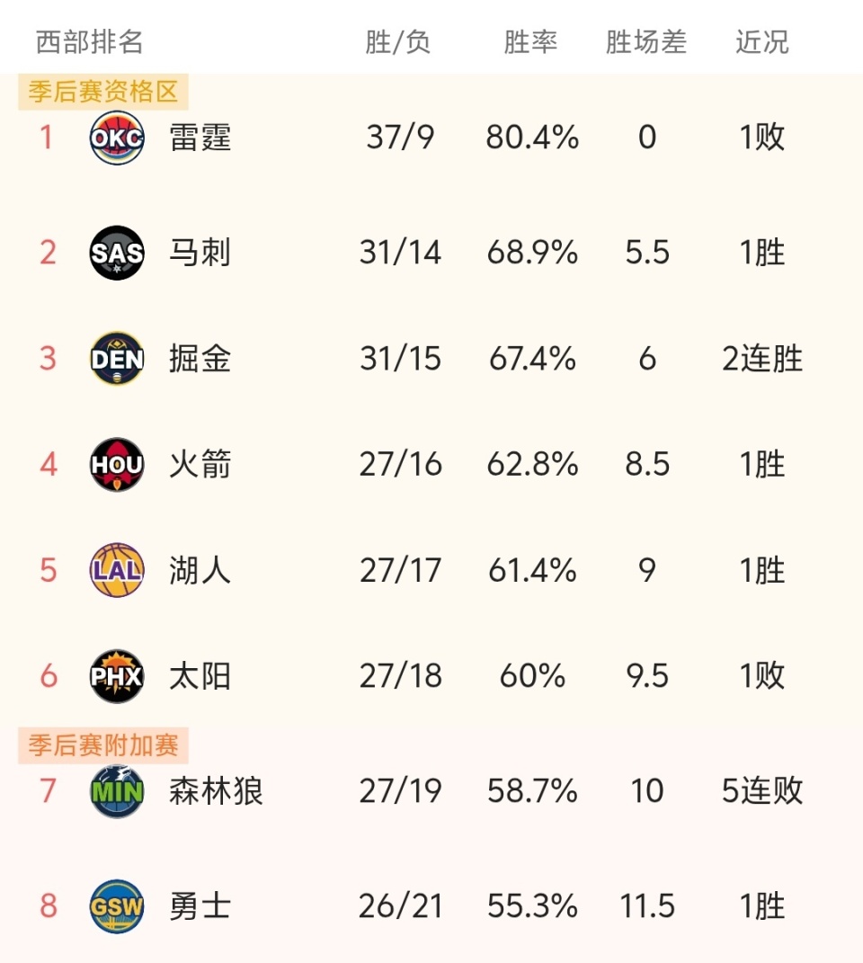 随着勇士111-85大胜森林狼,火箭+湖人利好,NBA最新积分榜:火箭第4!