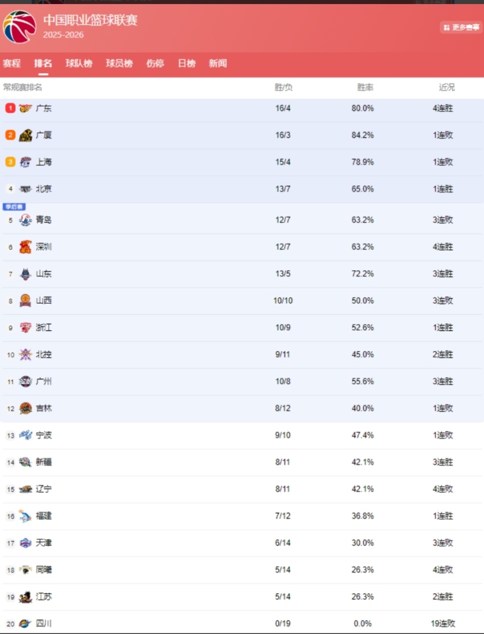 CBA最新排名: