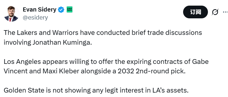 北京时间1月27日,名记Sidery报道,湖人和勇士近期围绕库明加展开了简短的交易谈判。勇士队已在私下明确表态:对于湖人队为库明加开出的交易筹码,他们并无实质兴趣。