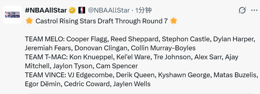 北京时间1月28日,NBA全明星新秀赛的分队选秀,执教三支球队的安东尼、麦迪和卡特挑选了各自心仪的球员,组成7人小队。在这次选秀中,独行侠的弗拉格成为状元秀,被安东尼率先挑走。而麦迪在第二顺位选走了黄蜂的克努佩尔,卡特则在第三顺位选走76人的埃奇库姆。杨瀚森此前确定入选发展联盟代表队,征战NBA新秀赛。