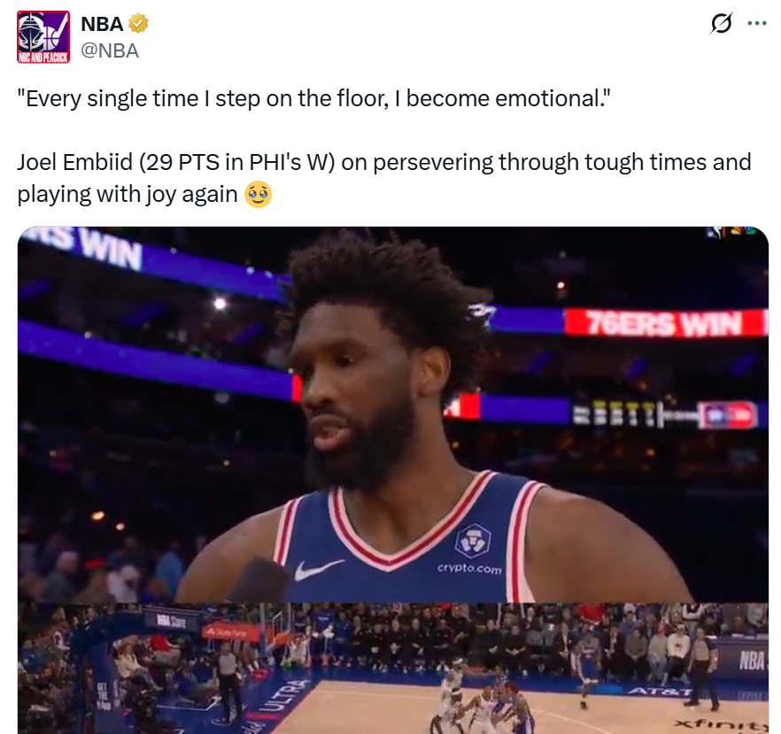赛后恩比德感慨道:“每次踏上球场,我都感慨万千激动不已,因为过去几年对我,对我的家人来说都非常艰难,现在终于稳定下来了。”