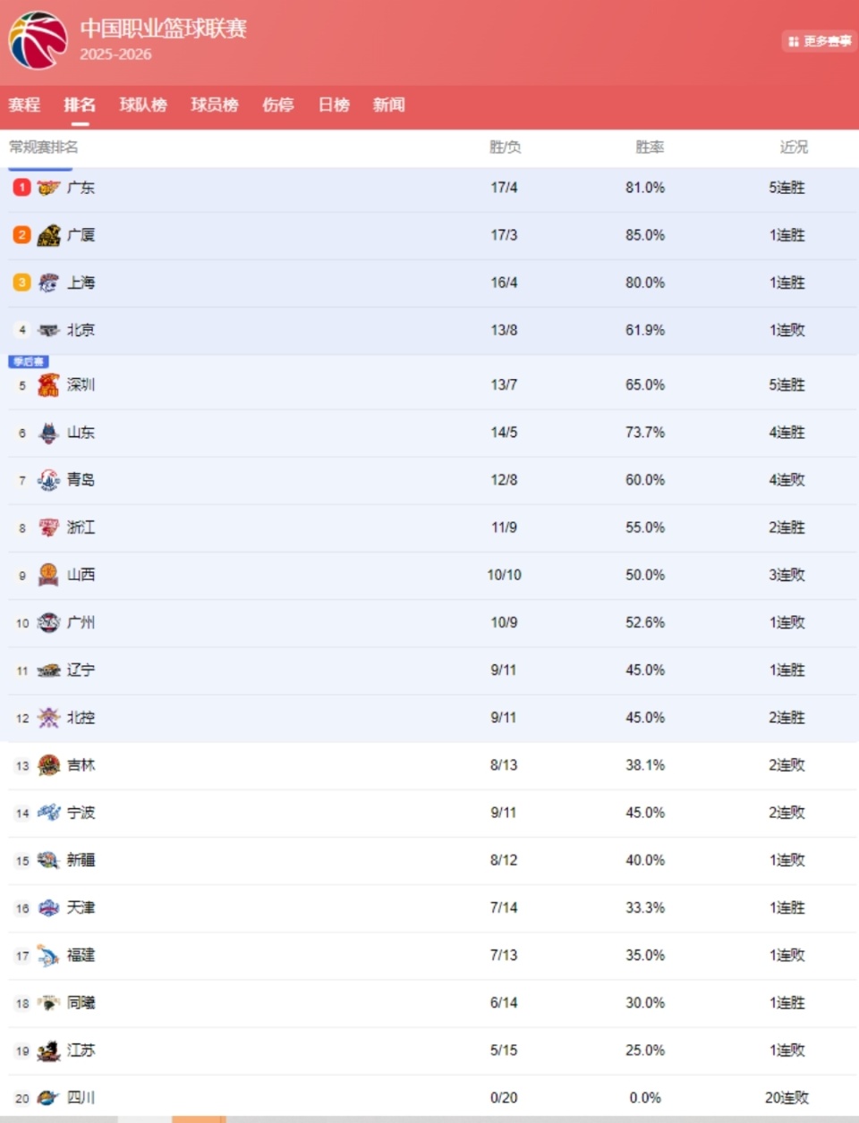 CBA最新排名:
