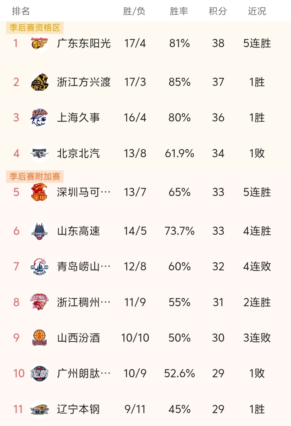 随着广东89-81胜吉林、北京负天津,CBA最新积分榜出炉:广东第1!