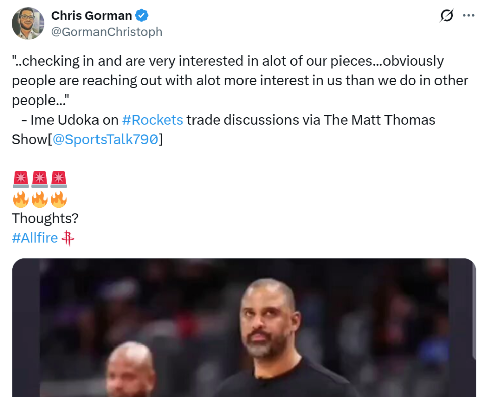 乌度卡表示内部正在讨论这一话题,电话的确一直响个不停,相比火箭主动联系其他球队,近期联系火箭询问潜在交易的其他球队明显更多。
