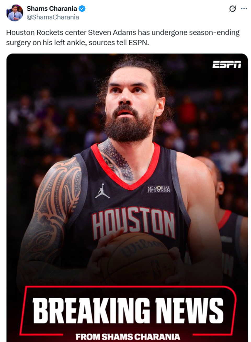 消息最先由ESPN名记Shams曝出,亚当斯左脚踝接受手术,确定赛季报销。随后火箭队官方确认消息真实性。