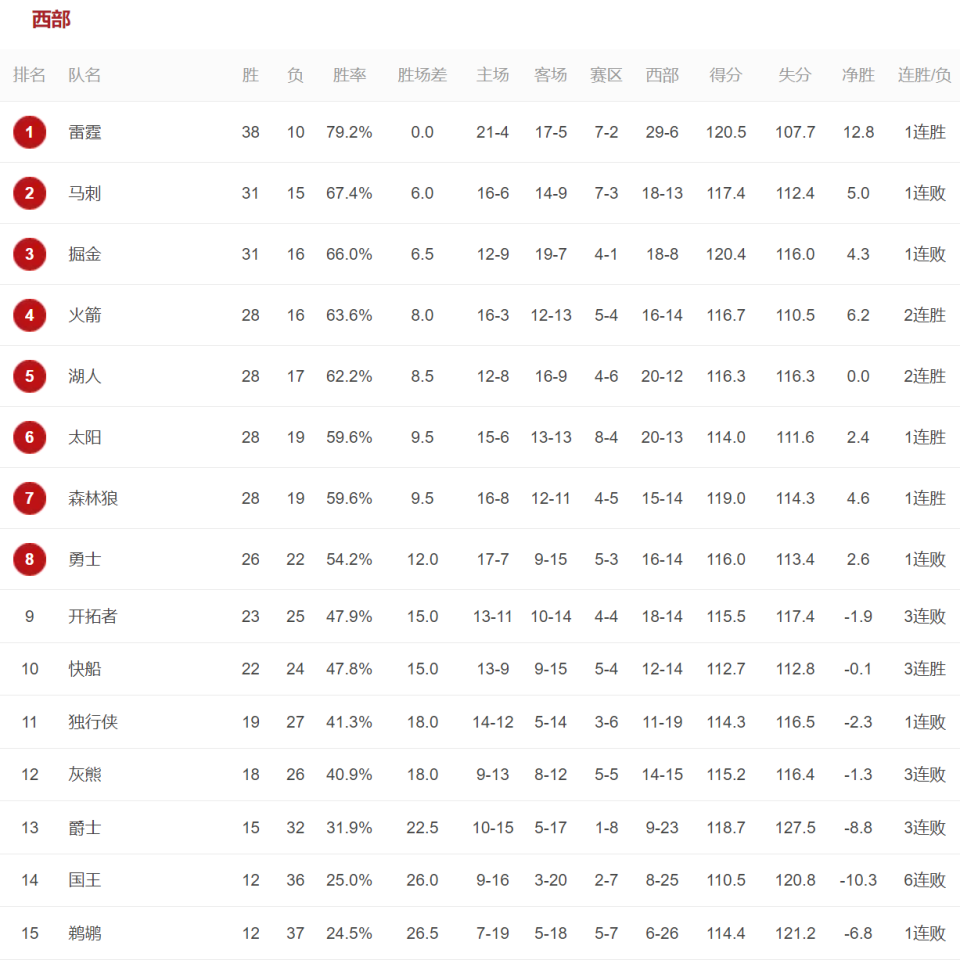 目前火箭28胜16负依然排名西部第四,落后第三的掘金1.5个胜场,领先第五的湖人0.5个胜场。西部第2-7名依然存在很大变数,第二的马刺领先第七的森林狼只不过3.5个胜场。可能常规赛最后一场打完了,这几队的排名才能确定!