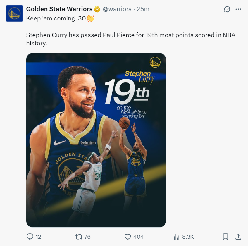 库里在nba历史得分榜上超越保罗-皮尔斯独享第19位。