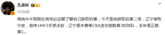 杨鸣中午刚刚在有球必应聊了聊自己辞职的事,今天是他辞职后第二场,辽宁惨败宁波,继伟14中3手感冰封,辽宁是本赛季CBA进攻倒数第3的球队,去年是正数第1。