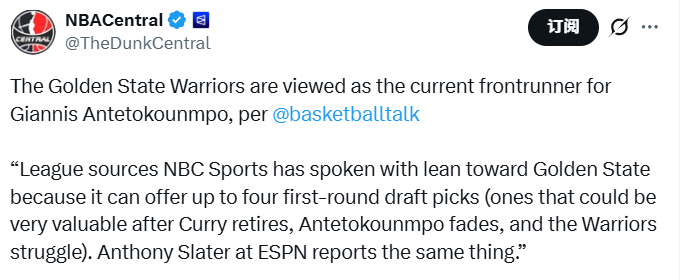 北京时间1月30日,据NBC体育报道,消息人士透露,金州勇士队处于字母哥争夺战的领跑位置,因为他们最多能拿出四个首轮签(考虑到库里退役、字母哥状态下滑后勇士或将陷入挣扎,这些选秀权未来价值可期)。勇士队记Slater也给出了相同报道。联盟高管认为:“雄鹿越快交易字母哥,勇士在竞价大战中胜出的几率就越大。”