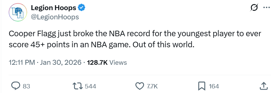 第七项:19岁40天的弗拉格成为史上单场得分45+最年轻的球员。