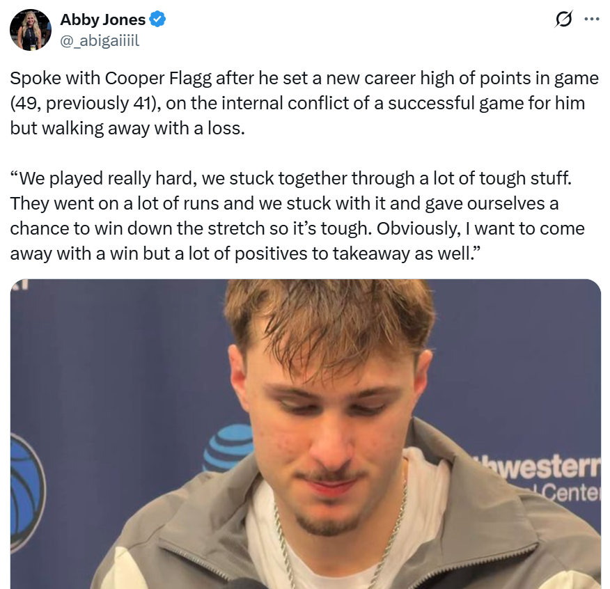 赛后谈到与弗拉格同场对决,克努佩尔坦言:“全明星赛时自己会与他见面,然后我俩准备在那个周末之后一起回一趟杜克大学,刚才我俩就在聊这些。”