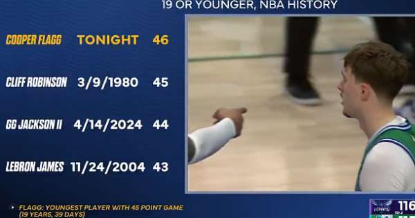 本场比赛的最大亮点,无疑是弗拉格对历史纪录的颠覆。凭借49分的超高得分,他成功创造了NBA历史19岁及以下球员的单场得分纪录。在此之前,这一纪录由克里夫·罗宾逊在1980年创下,45分的成绩尘封了整整46年,期间包括詹姆斯、安东尼等多位传奇球星都未能触及。更值得称道的是,弗拉格以19岁39天的年龄,成为NBA史上最年轻的45+得分球员,以及最年轻40+10篮板的球员,将两项纪录同时收入囊中。