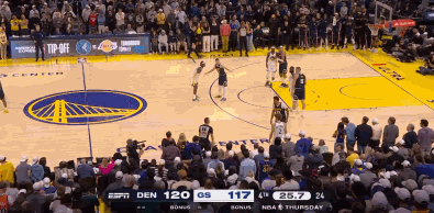 另外,在本赛季勇士和掘金比赛最后时刻。库里后场奔袭接追梦弧顶手递手传球后,绝平了掘金。防守中,约基奇准备提前围堵库里。库里则提前出手,完成命中。