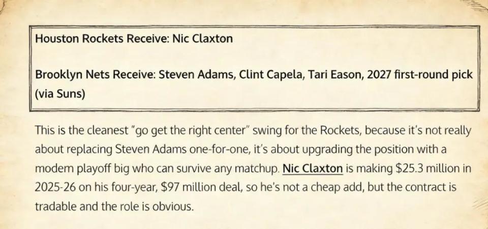 据悉,篮网中锋克拉克斯顿是火箭的潜在目标。为此,他们可能会提出亚当斯+卡佩拉+伊森+2027年首轮签(来自太阳)的报价。