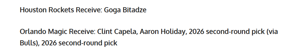 魔术得到:卡佩拉+霍勒迪+26年公牛二轮签+26年火箭二轮签。