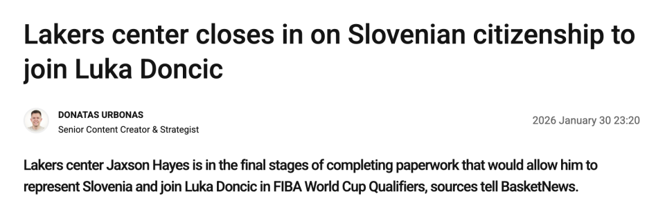 据BasketNews报道,湖人中锋海斯即将完成获得斯洛文尼亚公民身份的最后手续,非常有希望携手东契奇一起代表斯洛文尼亚出战今年的世界杯预选赛,两人有望继湖人以后在国际赛事再度成为队友。