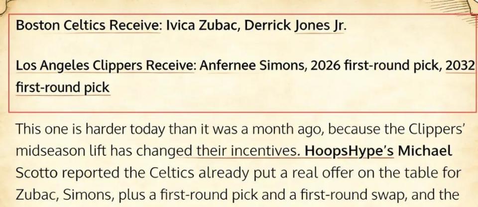 如今,凯尔特人有望提升他们报价,筹码变为:小西蒙斯+2026年首轮签+2032年的首轮签。