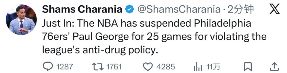 费城76人队全明星前锋保罗·乔治因违反联盟禁药相关规定,被禁赛25场。