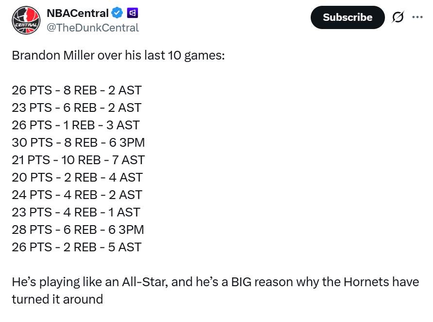 这也是过去10场米勒傲人表现的缩影,米勒已经连续10场比赛交出20+得分表现,期间黄蜂队10战8胜,他正在扮演起球队第一进攻得分点的责任。