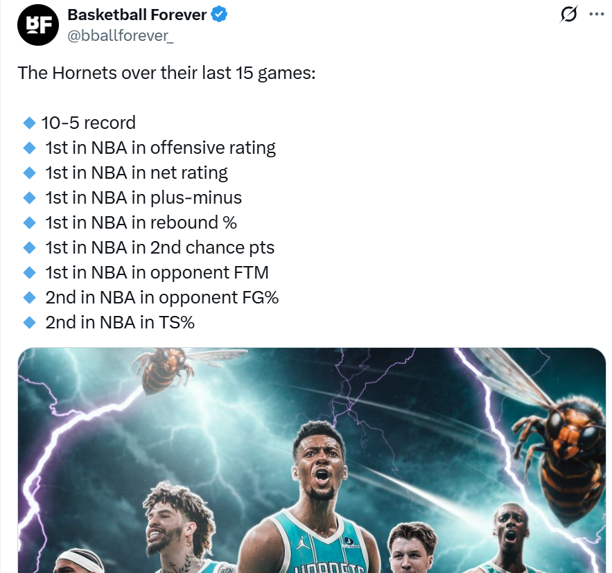 时隔10年再拿6连胜,摆烂数年无果的鱼腩黄蜂连斩西部前三终于熬出头!两大超新星领衔12战11胜首发五虎连创数项联盟第一。