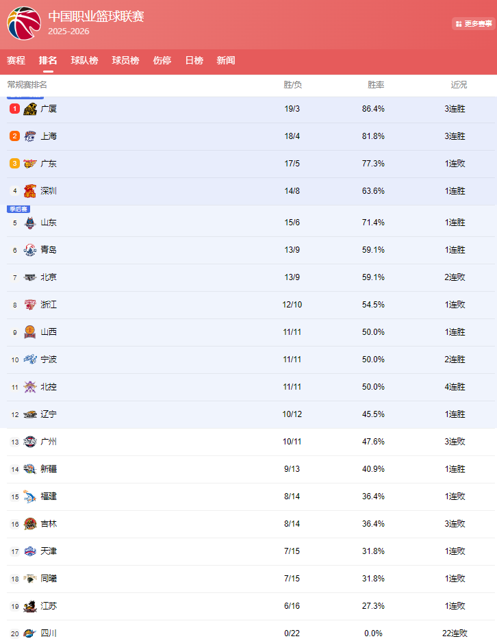 CBA打到现在,排名前3的队伍分别是广厦19胜3负,上海18胜4负,广东17胜5负,上海和广东之间的差距只有1场,咬的很死,谁都有登上第1的可能!