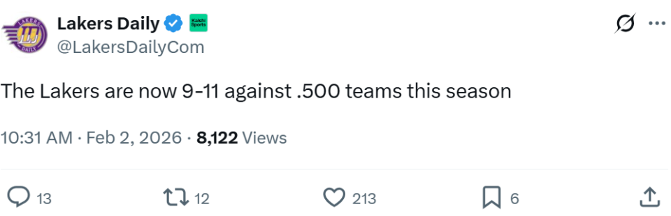 输给尼克斯之后,湖人本赛季对阵胜率超过50%的强队时,战绩跌至9胜11负,而对阵弱旅的战绩则为20胜8负。