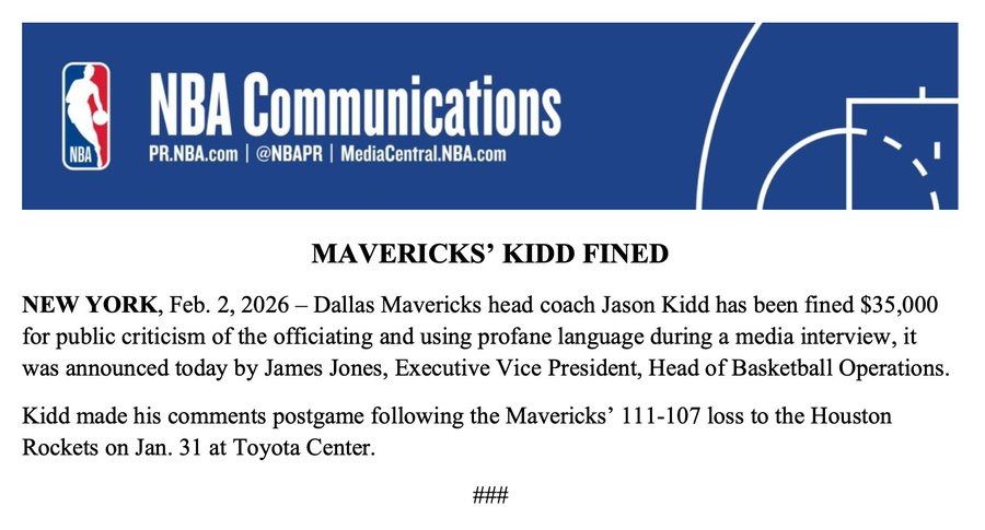 北京时间2月3日,NBA官方宣布,独行侠队主教练杰森-基德因在媒体采访中公开批评裁判执法并使用污言秽语,被处以35000美元罚款。