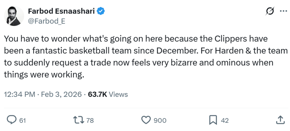 快船队记Farbod Esnaashari第一时间发文吐槽并表示是哈登团队提出交易申请,他写道:“真好奇到底发生了什么,从去年12月份至今快船队表现一直非常出色,结果哈登与其团队突然提出交易申请,这让人感到费解,也让人感到有些不安,尤其是一切顺利时。”