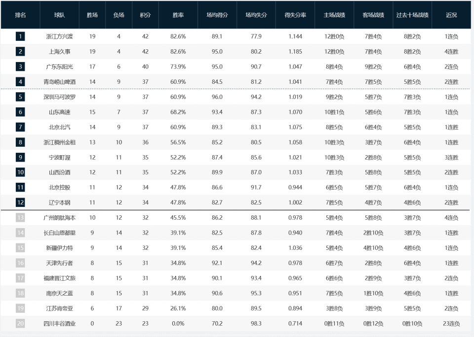 CBA积分榜:上海队积分追平广厦,青岛回升第四+北京排名第七