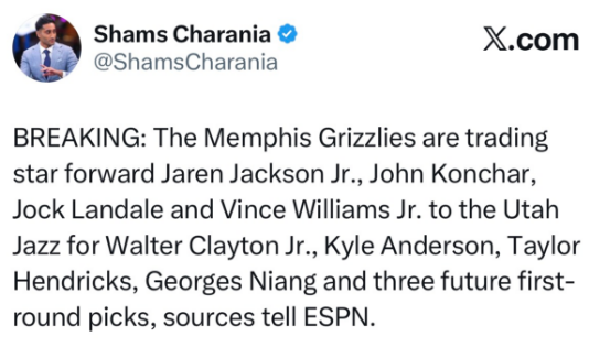 爆料王Shams:灰熊将3J+康查尔+兰代尔+小文斯-威廉姆斯送至爵士,换回李凯尔+小克莱顿+亨德里克斯+尼昂+三个首轮签。