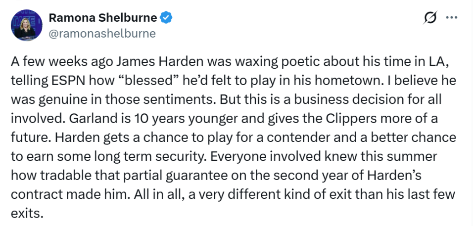 除了争冠这一固定的主线任务之外,美记Ramona Shelburne也在后续报道中指出,这一次哈登离队与此前几次不同的一点是他希望能够在骑士得到一份长期保障性续约合同。