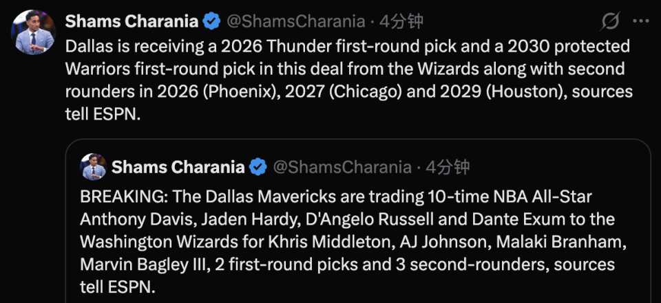 独行侠在这笔交易中从奇才获得了2026年雷霆的首轮选秀权和2030年勇士的受保护首轮选秀权,以及2026年(太阳)、2027年(公牛)和2029年(火箭)的次轮选秀权。