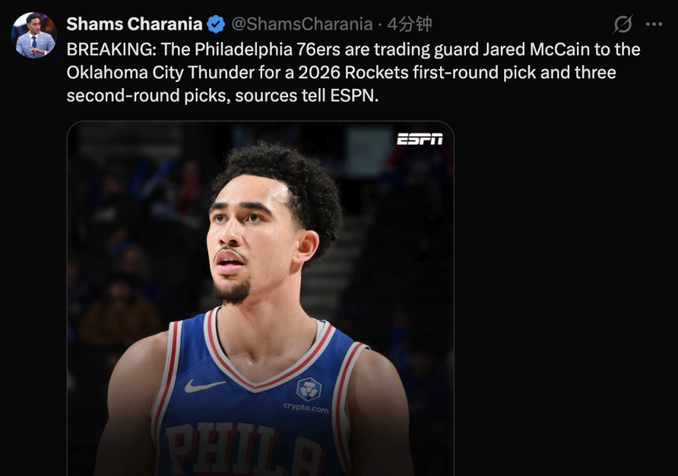 北京时间2月5日,据名记Shams报道,雷霆和76人达成4换1交易,雷霆将从火箭手中得到的26年首轮选秀权以及3个次轮选秀权(2027年涉及雷霆/火箭/步行者/热火),2028年雄鹿,2028年雷霆)送去费城,获得二年级新秀麦凯恩。